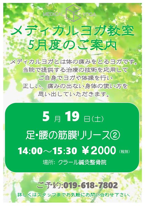 クラール鍼灸整骨院さんから、5月度のメディカルヨガ教室のご案内です。