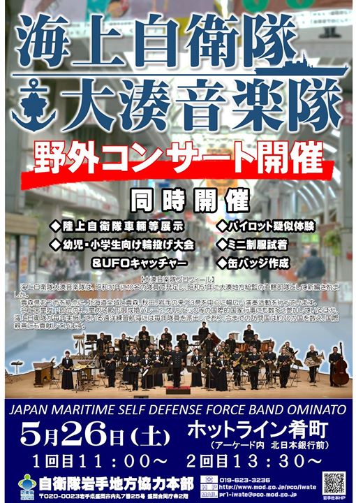 盛岡市肴町のホットライン肴町にて海上自衛隊大湊音楽隊野外コンサートを実施します。