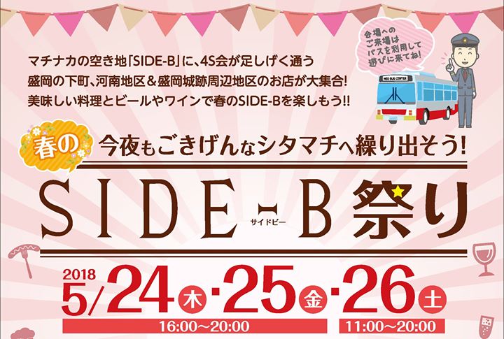 Side-Bで明日から始まる「春のSIDE-B祭り」。本当に楽しみです。ぜひ、夕暮れ時のSIDE-Bから、夜にかけては河南地区・盛岡城跡公園周辺の素敵なお店へ、みんなで盛岡のシタマチに繰り出して盛岡のステキな夜を満喫しましょう!