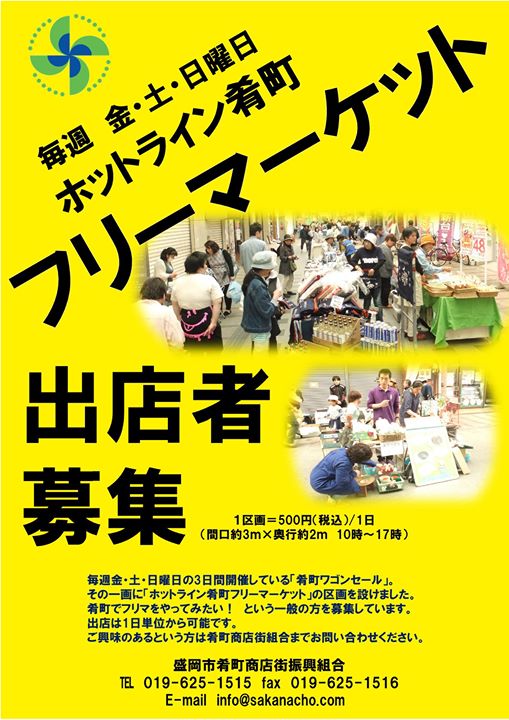 盛岡市肴町商店街では毎週 金・土・日に行う「ホットライン肴町フリーマーケット」の出店者募集を行っております。