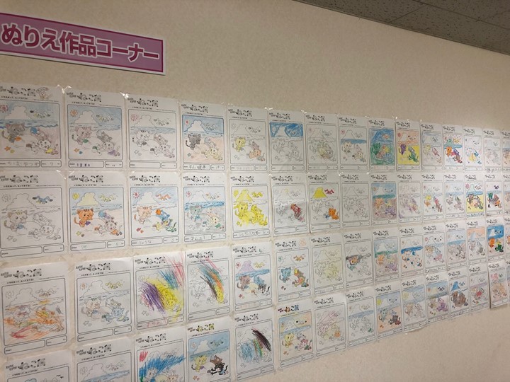 皆さまが描いてくださったねこちゃん達の✏️ぬりえ✏️を展示しておりますよ~☝️💕