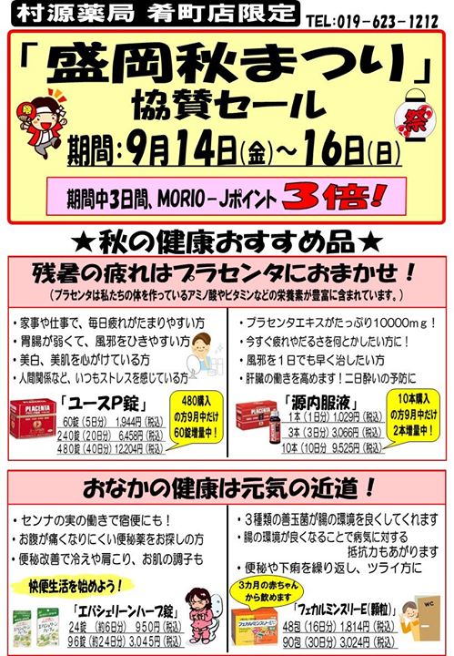 村源薬局さんから、「盛岡秋まつり協賛セール」のご案内です。 投稿者: 盛岡市肴町商店街振興組合青年部(4S会)2018年9月14日Facebook News 村源薬局さんから、「盛岡秋まつり協賛セール」のご案内です。 — 村源薬局 肴町店より 「盛岡秋まつり協賛セール」 のお知らせです。 期間中MORIOーJポイント3倍 お買得品品をご用意してお待ちしてます。 \ 最新情報をチェック / 共有: X で共有 (新しいウィンドウで開きます) X Facebook で共有 (新しいウィンドウで開きます) Facebook 関連 FacebookXBlueskyHatenaCopy