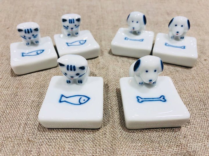 ねこちゃん、わんちゃんがご飯を前に「待て」をしているなんとも愛らしい箸置き。