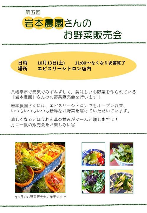 今週末10月13日(土)は「第五回 岩本農園さんのお野菜販売会」の日です!