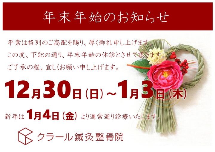 クラール鍼灸整骨院さんから、年末年始のお知らせです。 投稿者: 盛岡市肴町商店街振興組合青年部(4S会)2018年12月10日Facebook News クラール鍼灸整骨院さんから、年末年始のお知らせです。 — 🎍年末年始のお知らせです🎍 今年度は12月29日(土)までの営業となります。 寒さも本格的になってきました⛄ どうぞご自愛くださいませ。 宜しくお願い致しますm(_ _)m \ 最新情報をチェック / 共有: クリックして X で共有 (新しいウィンドウで開きます) X Facebook で共有するにはクリックしてください (新しいウィンドウで開きます) Facebook 関連 FacebookXBlueskyHatenaCopy