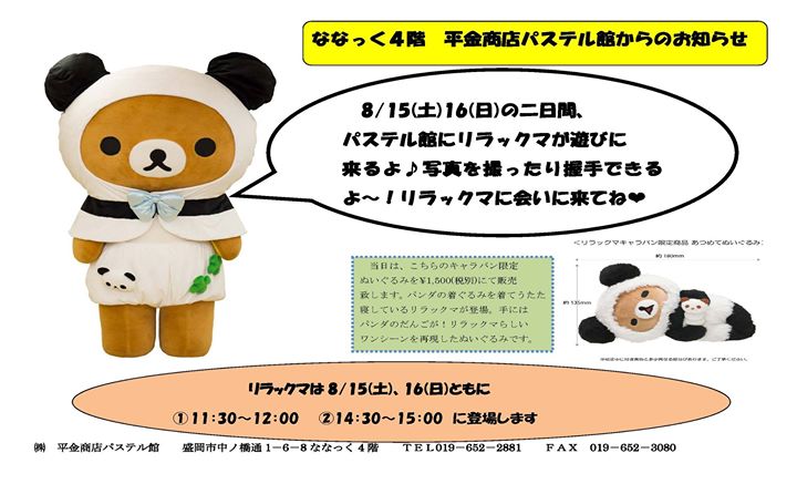 平金パステル館さんから、15日、16日、リラックマが遊びに来ているそうです! 投稿者: 盛岡市肴町商店街振興組合青年部(4S会)2015年8月15日Facebook News 平金パステル館さんから、15日、16日、リラックマが遊びに来ているそうです! Facebook \ 最新情報をチェック / 共有: クリックして X で共有 (新しいウィンドウで開きます) X Facebook で共有するにはクリックしてください (新しいウィンドウで開きます) Facebook 関連 FacebookXBlueskyHatenaCopy