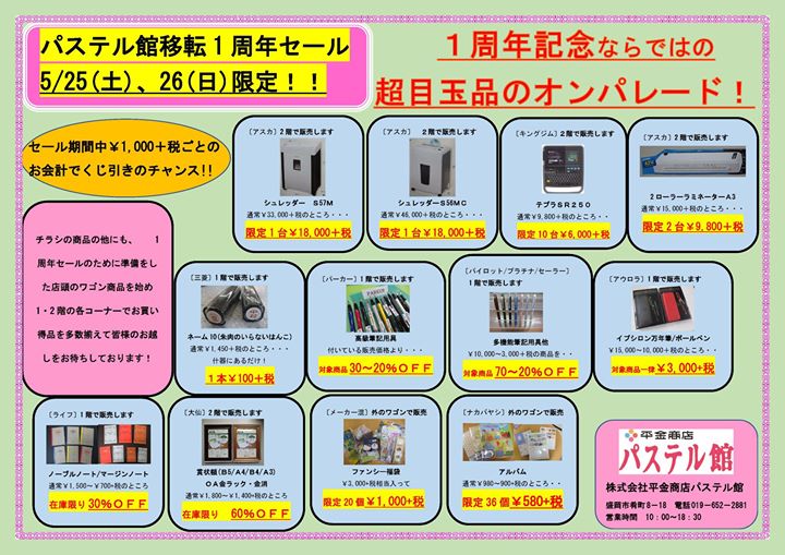 平金商店パステル館さん、移転1年おめでとうございます!周年セール開催とのことです。 投稿者: 盛岡市肴町商店街振興組合青年部(4S会)2019年5月23日Facebook News 平金商店パステル館さん、移転1年おめでとうございます!周年セール開催とのことです。 — パステル館【移転1周年セール】のお知らせ パステル館本店が肴町アーケードに移転して1周年となります♪ 5月25日(土)、26日(日)の2日間【移転1周年セール】を行いますので、ぜひパステル館にお越しください。 \ 最新情報をチェック / 共有: X で共有 (新しいウィンドウで開きます) X Facebook で共有 (新しいウィンドウで開きます) Facebook 関連 FacebookXBlueskyHatenaCopy