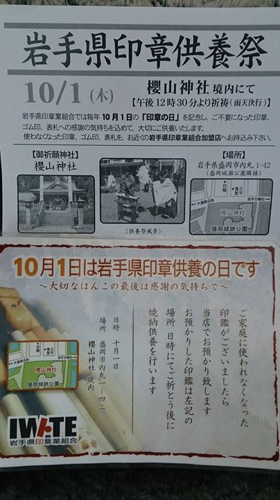 スズエ印房さんより、10月1日は「印章の日」にわせた岩手県印章供養祭についてご案内です! 投稿者: 盛岡市肴町商店街振興組合青年部(4S会)2015年9月3日Facebook News スズエ印房さんより、10月1日は「印章の日」にわせた岩手県印章供養祭についてご案内です! Facebook \ 最新情報をチェック / 共有: X で共有 (新しいウィンドウで開きます) X Facebook で共有 (新しいウィンドウで開きます) Facebook 関連 FacebookXBlueskyHatenaCopy