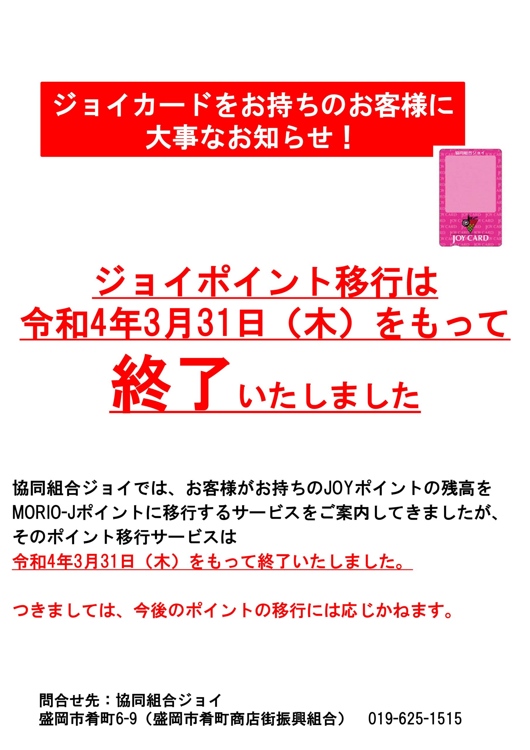協同組合ジョイからのお知らせ。 ジョイポイント移行サービスの終了について 投稿者: 肴町商店街 事務局2022年3月31日2022年3月31日Facebook News \ 最新情報をチェック / 共有: X で共有 (新しいウィンドウで開きます) X Facebook で共有 (新しいウィンドウで開きます) Facebook 関連 FacebookXBlueskyHatenaCopy