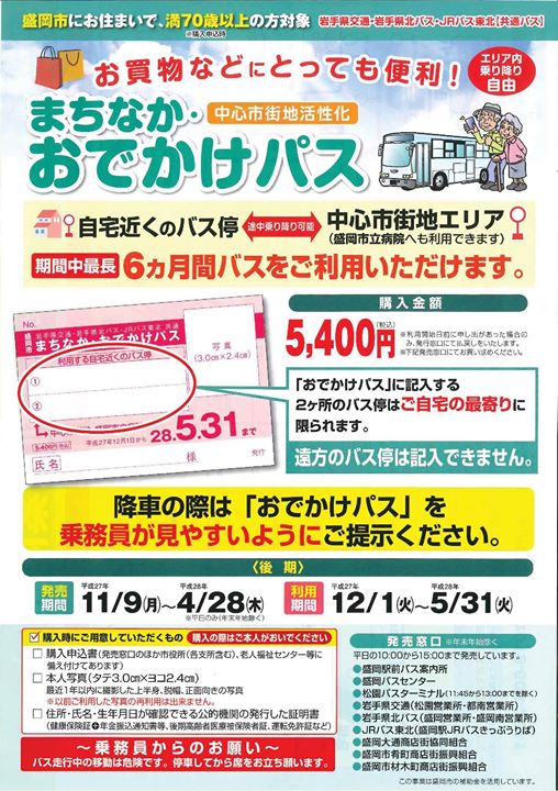 盛岡市にお住まいで、満70歳以上のの方を対象としたおでかけパスはご自宅近くのバス停から中心市街地エリアへのバスをご利用いただけます。
