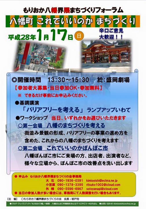 もりおか八幡界隈まちづくりフォーラムさんからご案内です。 投稿者: 盛岡市肴町商店街振興組合青年部(4S会)2015年12月22日Facebook News もりおか八幡界隈まちづくりフォーラムさんからご案内です。来年2016年1月17日日曜日、〜八幡町 これでいいのか まちづくり〜もりおか八幡界隈まちづくりフォーラムを開催されるとのことです。 八幡町のこれからのまちづくりについて、あるいは八幡ぽんぽこ市のあり方について、多くの皆さんからのご意見をお聞かせください。「辛口」ご意見大歓迎、との事。よろしければぜひ、肴町経由でご参加いただけると嬉しいです。 Facebook \ 最新情報をチェック / 共有: クリックして X で共有 (新しいウィンドウで開きます) X Facebook で共有するにはクリックしてください (新しいウィンドウで開きます) Facebook 関連 FacebookXBlueskyHatenaCopy