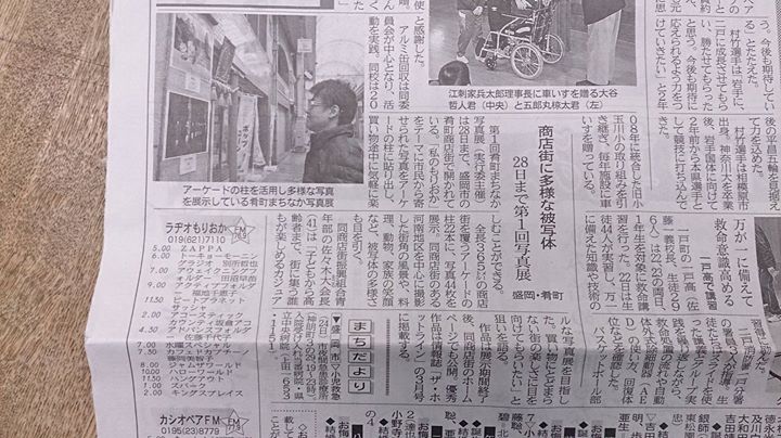 【肴町まちなか写真展 2月28日まで】 投稿者: 盛岡市肴町商店街振興組合青年部(4S会)2016年2月26日Facebook News 【肴町まちなか写真展 2月28日まで】 今週水曜日の岩手日報様に第1回肴町まちなか写真展を取上げていただきました。ありがとうございます。コチラでもご紹介をさせて頂きます。 早いもので、2016年2月28日(日)で会期終了となります。まだご覧になられていない方、もう一度、二度、ご覧になりたい方、ぜひぜひ、足を運んでご覧いただければと思います! Facebook \ 最新情報をチェック / 共有: クリックして X で共有 (新しいウィンドウで開きます) X Facebook で共有するにはクリックしてください (新しいウィンドウで開きます) Facebook 関連 FacebookXBlueskyHatenaCopy
