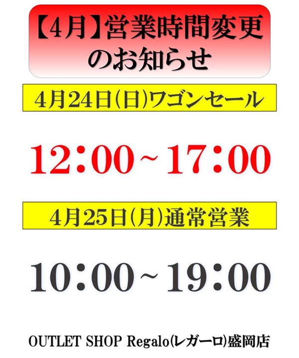 OUTLET SHOP『Regalo(レガーロ)』盛岡店さんからのお知らせです!! 投稿者: 盛岡市肴町商店街振興組合青年部(4S会)2016年4月23日Facebook News OUTLET SHOP『Regalo(レガーロ)』盛岡店さんからのお知らせです!! ーーーーーーー 明日4月24日(日)の営業時間は12:00〜17:00になりますので、ご注意下さい! マル秘イベントも開催しますので是非ご来店下さい♪ Facebook \ 最新情報をチェック / 共有: X で共有 (新しいウィンドウで開きます) X Facebook で共有 (新しいウィンドウで開きます) Facebook 関連 FacebookXBlueskyHatenaCopy