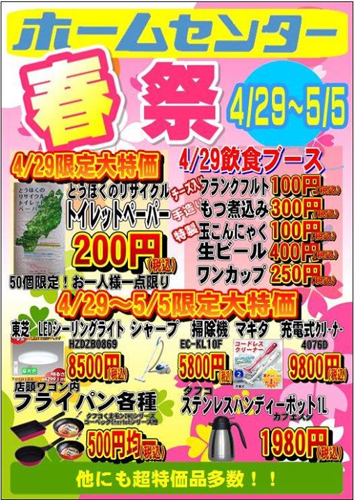 肴町ホームセンターさんからは肴町春祭りに合わせ、ホームセンター春祭りのご案内です。 投稿者: 盛岡市肴町商店街振興組合青年部(4S会)2016年4月28日Facebook News 肴町ホームセンターさんからは肴町春祭りに合わせ、ホームセンター春祭りのご案内です。 トイレットペーパー200円!?を始め、特価品は勿論ですが、飲食コーナーも展開! しかも肴町春祭りの特設ステージすぐ向かいにてやっております。 民謡と津軽三味線聴きながらモツ煮込みツマミにちょっと一杯♪ 御子さんとガンライザーNEOと握手撮影してから飲むビールも最高♪ 4/29は是非ホームセンターさんまでお越しください^^ Facebook \ 最新情報をチェック / 共有: クリックして X で共有 (新しいウィンドウで開きます) X Facebook で共有するにはクリックしてください (新しいウィンドウで開きます) Facebook 関連 FacebookXBlueskyHatenaCopy