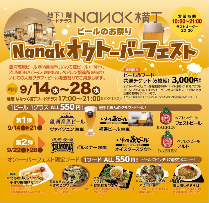 ななっくさんから、ビールのお祭り『Nanakオクトーバーフェスト』のご案内です。