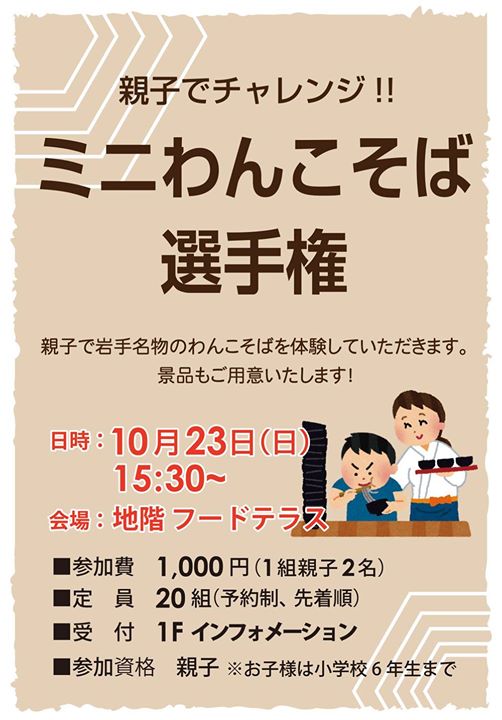ミニわんこそば選手権、参加者募集中です!ななっくさんからです。 投稿者: 盛岡市肴町商店街振興組合青年部(4S会)2016年10月17日Facebook News ミニわんこそば選手権、参加者募集中です!ななっくさんからです。 — まだまだ参加者募集中です! 『親子でチャレンジ!!ミニわんこそば選手権』 ぜひ、親子でのご参加お待ちしております☆★ 日時:10月23日(日) 15:30~ 場所:地下1階 フードテラス 参加費:1,000円(1組親子2名) 定員:20組様(予約制 先着順) 参加資格:親子 ※お子様は小学校6年生まで 申込受付:1階 インフォメーション Facebook \ 最新情報をチェック / 共有: X で共有 (新しいウィンドウで開きます) X Facebook で共有 (新しいウィンドウで開きます) Facebook 関連 FacebookXBlueskyHatenaCopy
