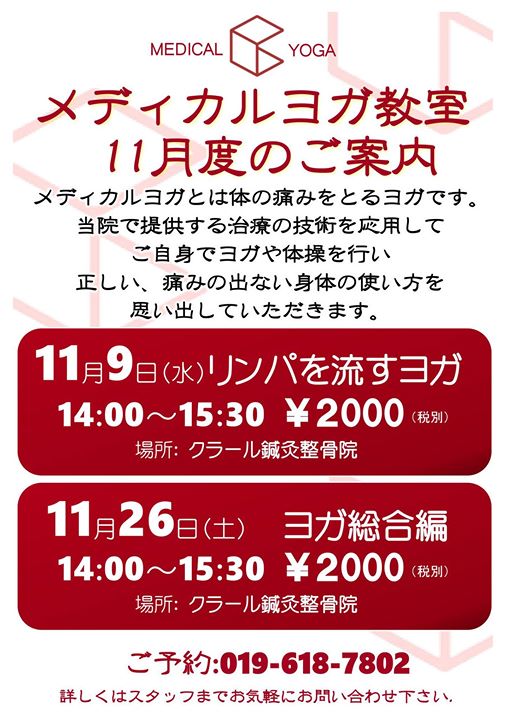 クラール鍼灸整骨院さんから、11月のメディカルヨガ教室のご案内です。