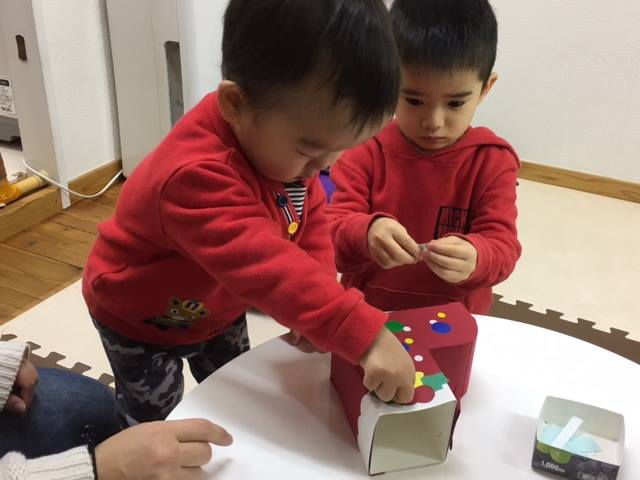 クリスマスブーツにシールを一生懸命ぺったんぺったんしておりました^^