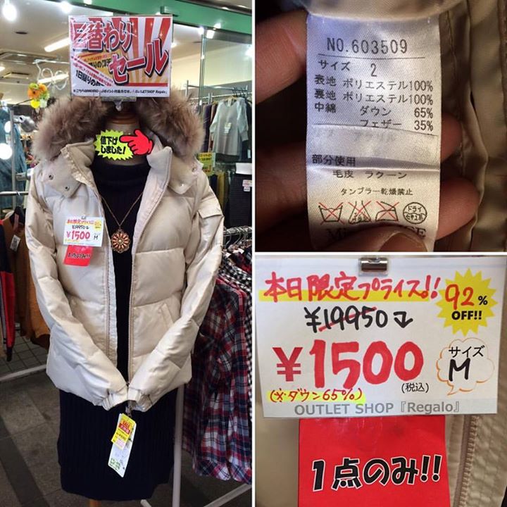 OUTLET SHOP『Regalo(レガーロ)』盛岡店さんからのお知らせです! 投稿者: 盛岡市肴町商店街振興組合青年部(4S会)2017年1月26日Facebook News OUTLET SHOP『Regalo(レガーロ)』盛岡店さんからのお知らせです! —– 本日の日替わりセール品はこれだ!! ラクーンファーダウンジャケット!!(ダウン65%・フェザー35%) 定価19950円→レガーロ特価【※92%OFF※】1500円!! #盛岡 #中ノ橋通 #肴町商店街 #アウトレットショップレガーロ #アウトレット #Regalo #激安 #セレクトショップ #割引 #セール #特別価格 #限定 #新入荷 #1点モノ #日替わり #大人気 #ダウンジャケット Facebook \ 最新情報をチェック / 共有: クリックして X で共有 (新しいウィンドウで開きます) X Facebook で共有するにはクリックしてください (新しいウィンドウで開きます) Facebook 関連 FacebookXBlueskyHatenaCopy