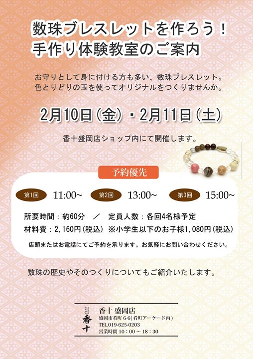 香十盛岡店 2月イベント情報 投稿者: 盛岡市肴町商店街振興組合青年部(4S会)2017年1月30日Facebook News 香十盛岡店 2月イベント情報 盛岡市肴町アーケード内 「香十盛岡店」では2月に2種類の体験教室を開催いたします。 ・数珠ブレスレットを作ろう! 2月10日~11日 ・手作り香り袋体験会 2月24日~25日 どちらも予約優先ですので是非お早めにご予約ください。 香十盛岡店 019-625-0203 Facebook \ 最新情報をチェック / 共有: クリックして X で共有 (新しいウィンドウで開きます) X Facebook で共有するにはクリックしてください (新しいウィンドウで開きます) Facebook 関連 FacebookXBlueskyHatenaCopy