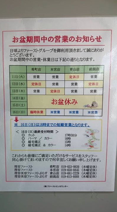 【理容美容ファーストさん お盆中の営業日について】 投稿者: 盛岡市肴町商店街2015年7月17日Facebook News 【理容美容ファーストさん お盆中の営業日について】 理容美容ファーストさん、お盆中の営業日のお知らせです! \ 最新情報をチェック / 共有: X で共有 (新しいウィンドウで開きます) X Facebook で共有 (新しいウィンドウで開きます) Facebook 関連 FacebookXBlueskyHatenaCopy