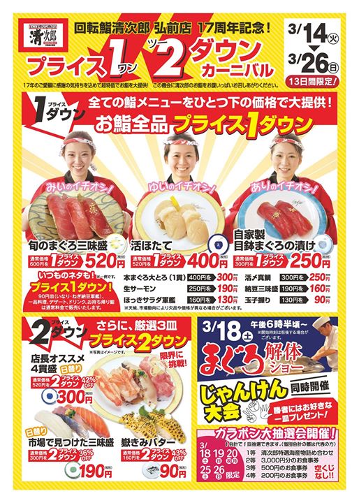 清次郎グループさんからご案内です! 投稿者: 盛岡市肴町商店街振興組合青年部(4S会)2017年3月16日Facebook News 清次郎グループさんからご案内です! — こんにちは。清次郎です! 今日は、中学校の卒業式というところも多いようですね。 盛岡市は、昨夜の雪もとけて日差しも出てきました。 中学校卒業おめでとうございます。ステキな一日になる事を願っております。 回転鮨清次郎・田清魚店・肴町酒場・鮨清次郎紫波・COFFEE&WINE4832など清次郎グループでお祝いのお食事はいかがですか。 清次郎弘前店では、お得な楽しいフェア開催中ですよ(^^) Facebook \ 最新情報をチェック / 共有: X で共有 (新しいウィンドウで開きます) X Facebook で共有 (新しいウィンドウで開きます) Facebook 関連 FacebookXBlueskyHatenaCopy
