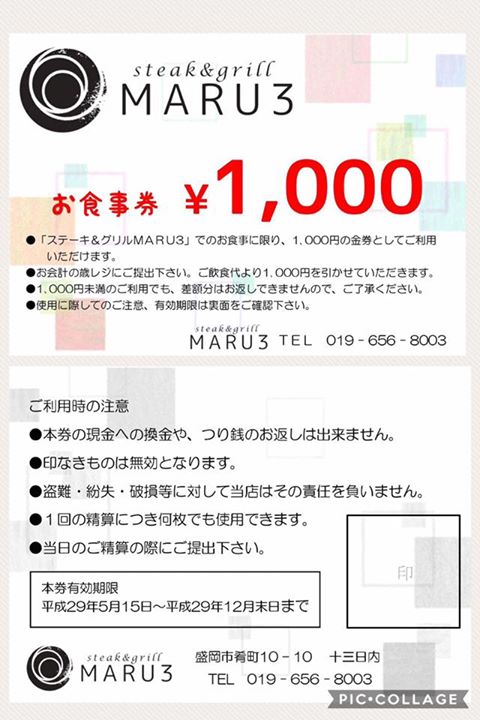 そんな中、steak&grill MARU3では、4月29日(土)より特別割引券を販売する事になりました。