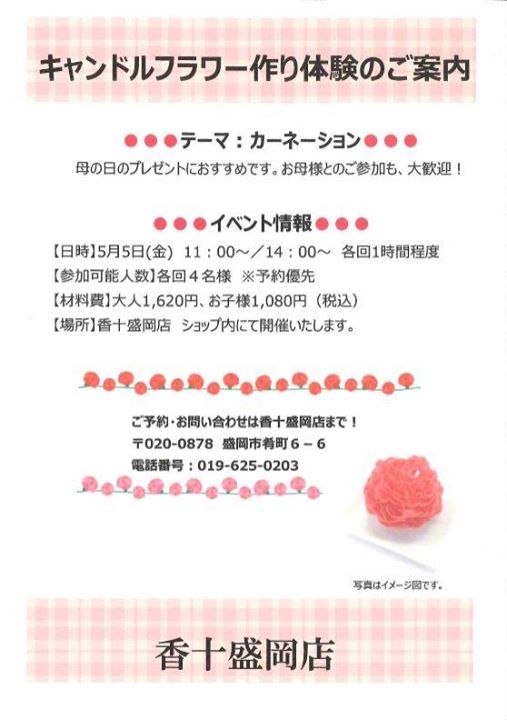 香十さんからはキャンドルフラワー作り体験を開催します。テーマはカーネーションという事で、子供の日に楽しく作って母の日にプレゼント♪とみんなが嬉しくなっちゃうイベントです。