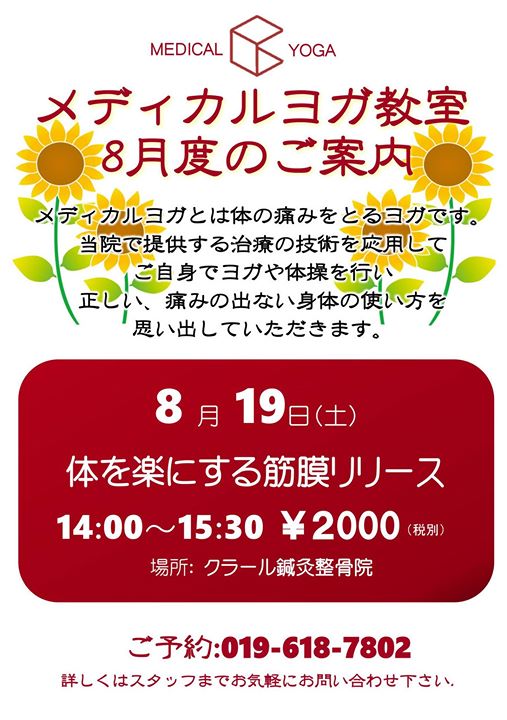 クラール鍼灸整骨院さんから、8月のメディカルヨガ教室のご案内です。