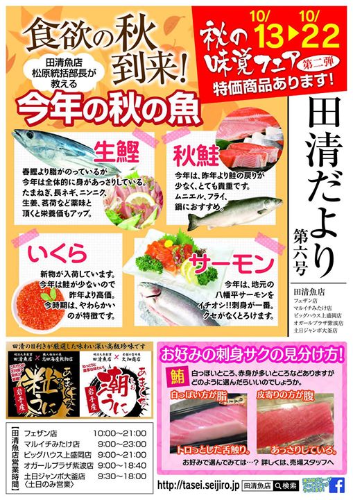 清次郎さんから、10月22日まで、お得な情報です! 投稿者: 盛岡市肴町商店街振興組合青年部(4S会)2017年10月18日Facebook News 清次郎さんから、10月22日まで、お得な情報です! — こんばんは。清次郎です! 盛岡の街並みも秋らしく木々が色づいてきました。田清魚店では、22日まで、「秋の味覚フェア」を開催!日替わりでお得な商品もありますよ(^0^) Facebook \ 最新情報をチェック / 共有: X で共有 (新しいウィンドウで開きます) X Facebook で共有 (新しいウィンドウで開きます) Facebook 関連 FacebookXBlueskyHatenaCopy