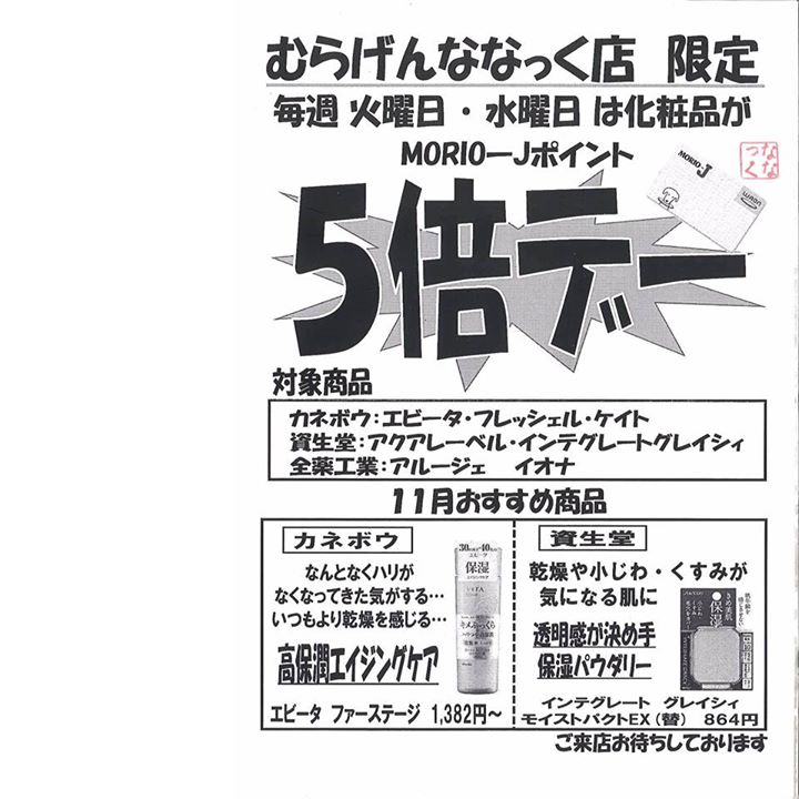 ななっくさんからです。地下1Fの村源ななっく店、化粧品販売始まりました、とのこと。